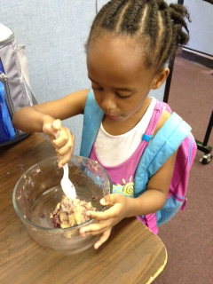 At the end of camp at the East site, one of the students stayed in class with me until the other kids left to play outside. She then took her spoon out and began to eat the left over “Ice Cream” I had in my bowl asking me, “Can I eat the rest of this? It’s so yummy!” It was already too late for me to say no, since she had already taken a bite, so I let her finish the bowl. I’m really glad some of the kids LOVED this dessert! It’s a great alternative to ice cream, and you don’t have to feel guilty if you eat it every day!