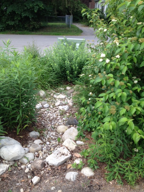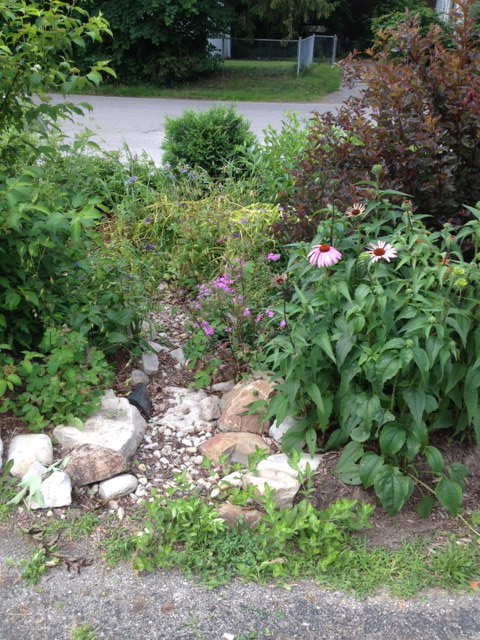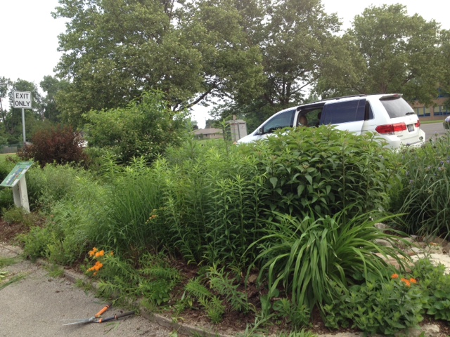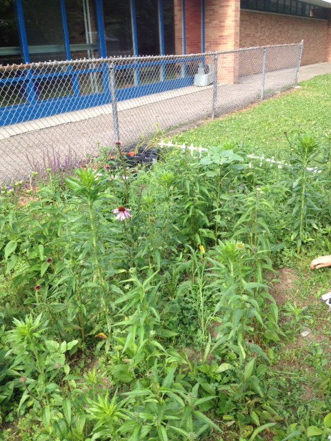 This rain garden is located at the entrance of the school’s parking lot and was previously just a curb island covered in grass. Planted and modified this rain garden now filters rain water, serves as habitat, and is a much more pleasing sight to be had.