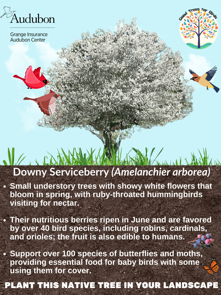 Lastly, I worked on creating educational signage for our native trees around the center, highlighting their benefits to birds. Our master gardeners provided the information on each tree, and I turned it into engaging graphics. This project gave me the opportunity to be creative while also learning more about Ohio’s native trees, including river birch, downy serviceberry, swamp white oak, and pagoda dogwood. One of the most enjoyable parts of this task was designing a logo for the series, “Good Trees for Birds,” and experimenting with generative AI on Canva. The AI tool made the design process fun and efficient, allowing me to experiment with different styles and layouts. I’ve included an example of the signage below.